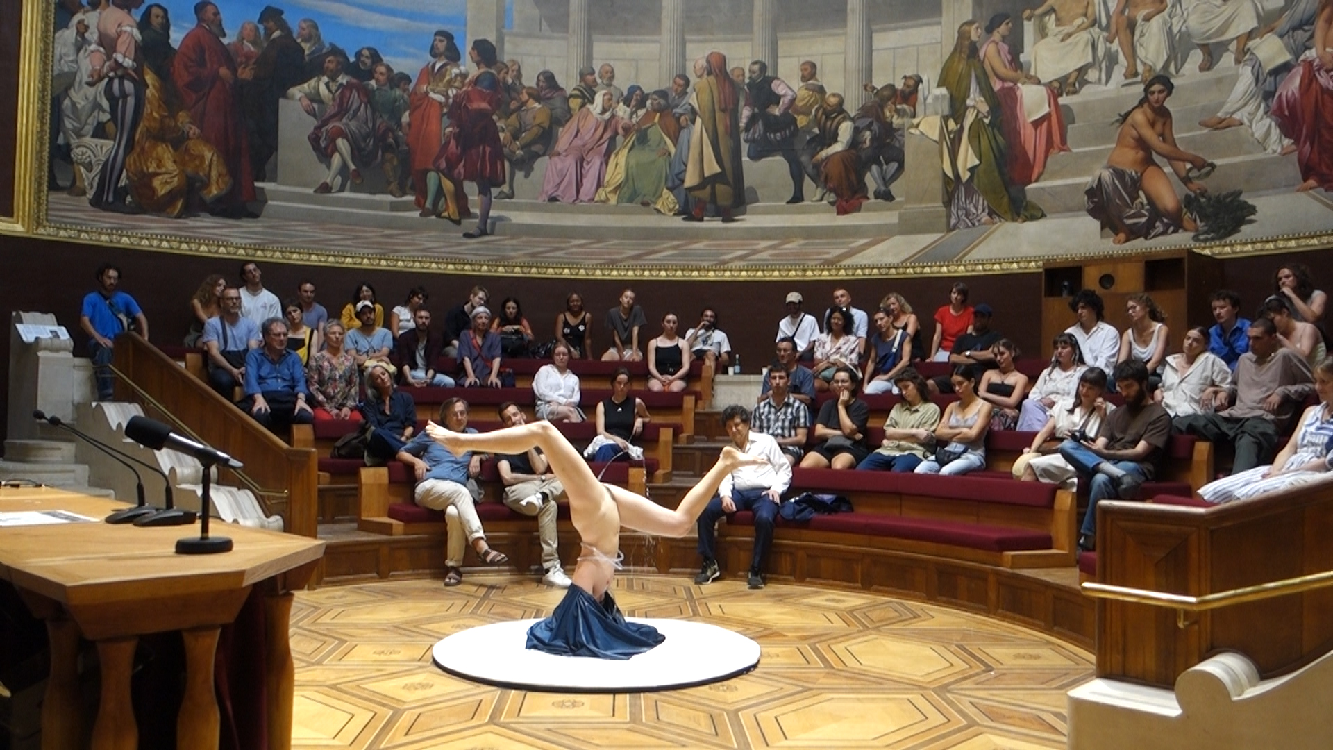 La réponse apparaît in situ. Il suffit de lever les yeux vers la fresque dont le peintre Paul Delaroche (1797-1856) a décoré l’amphithéâtre, Le Génie des arts entouré des artistes de tous les temps distribuant des couronnes (1836-1841), plus communément appelée La Renommée distribuant des couronnes, une vaste frise réunissant soixante-quinze grands artistes du passé sur les marches d’un péristyle antiquisant. Béryl Coulombié, placée comme elle l’est au centre de l’hémicycle, respecte strictement la formule illusionniste d’un programme monumental censé célébrer la continuité pédagogique des beaux-arts : l’étudiante se trouve face à la figure éponyme de la fresque, cette « Renommée » ou « Génie des arts » qui, assise au premier plan et au centre, s’apprête à lancer vers la scène une des couronnes de laurier entassées derrière elle. L’amphithéâtre d’honneur est la salle des prix. L’artiste a eu le sens des circonstances et, je dirais, des circularités ; elle a installé sa « sculpture de courte durée » là où peinture et architecture superposent virtuellement leurs cercles respectifs : « J’ai placé Fontaine au centre, sous la coupole, comme si lancée par le Génie la couronne circulaire se métamorphosait. »