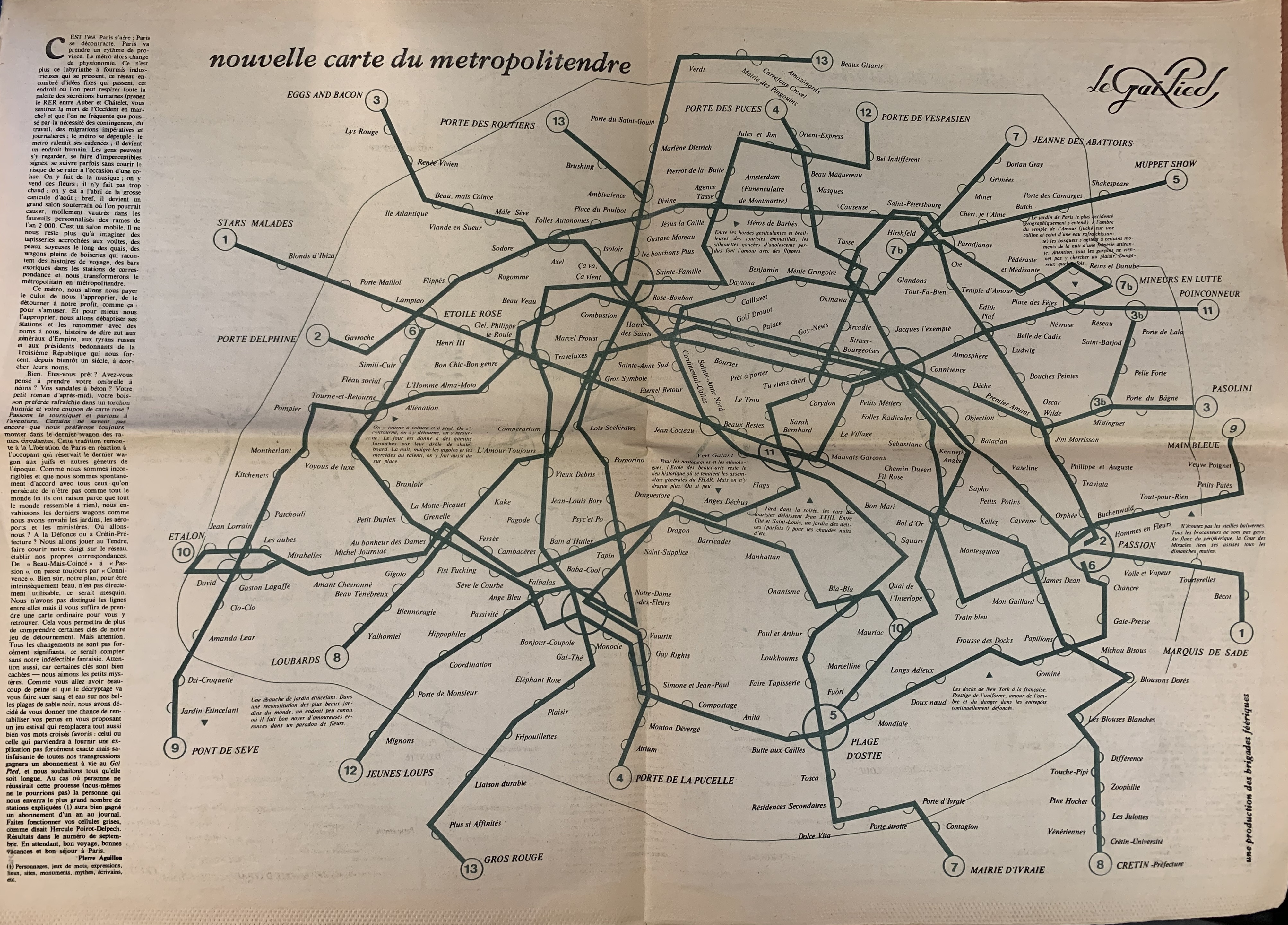 En 1971, le FHAR (Front d’action homosexuel révolutionnaire) publie le Rapport contre la normalité dans lequel se trouve « Pour une conception homosexuelle du monde ». Cette conception tient à la possibilité de vivre, d’aimer et d’habiter autrement qu’en suivant les pratiques du régime hétérosexuel et bourgeois. Plus récemment, en 2013, Patrick Cardon des éditions Gaykitschcamp republiait ce Rapport dans l’optique d’une « politique vivante de la mémoire », c’est-à-dire pour que cette archive puisse servir aux mouvements queers contemporains qui cherchent à s’affranchir des normes vectrices de domination — notamment des politiques identitaires. En 2017, Alain Naze tentait de renouer avec l’héritage de la lutte homosexuelle des années 1970 en écrivant son Manifeste contre la normalisation gay. Aujourd’hui, nous voulons contribuer à cette politique en présentant, pour la première fois depuis sa parution originale en 1979, une archive des débuts de la revue Gai Pied : la Carte du métropolitendre, qui substitue aux stations de métro parisiennes des références à la culture gaie et lesbienne du temps. C’est par le hasard lors d’une recherche au centre Maurice Chalumeau pour les Sciences des Sexualités (CMCSS) de Genève que nous l’avons découverte. Elle se trouve au croisement de nos deux recherches : d’une part, une recherche littéraire sur des témoignages de réception d’œuvres gaies et lesbiennes de la Belle Époque, d’autre part une recherche architecturale sur la production des normes du genre, de la famille, et de leurs alternatives. Gai Pied est fondé en 1979 par Jean Le Bitoux (historien de la déportation homosexuelle) autour de plusieurs personnalités du militantisme dont, entre autres Frank Arnal (qui reprendra la direction autour de 1981), Jean-Pierre Joecker (qui co-fondera la revue Masques la même année) et Gilles Barbedette (qui écrira Paris gay 1925 [1] Michel Foucault est également partie prenante de la création du Gai Pied : en soufflant le nom jeu de mot sur le danger d’être ouvertement gay à l’époque — et en écrivant un article dans le premier numéro, il fait partie d’un de ceux qui permettront de protéger la revue de la censure dans le contexte hostile de pré-légalisation de l’homosexualité (seulement en 1981). Son soutien — ainsi que celui d’autres intellectuels — épargnera peut être au Gai Pied le triste sort de Gaie Presse (Bel Air [2]), dont les quelques numéros publiés en 1978 avant sa censure recèlent notamment les écrits de Guy Hocquenghem, René Schérer et d’autres qui se retrouveront collaborateur·rice·s des revues ultérieures. Gaie Presse fait l’état d’un constat : « De toute façon, la vie pédée n’est pas très gaie à Paris. Elle est hétérosexualisée » [3]. C’est pour lutter contre cette normalisation que la presse homosexuelle militante émerge en 1979.