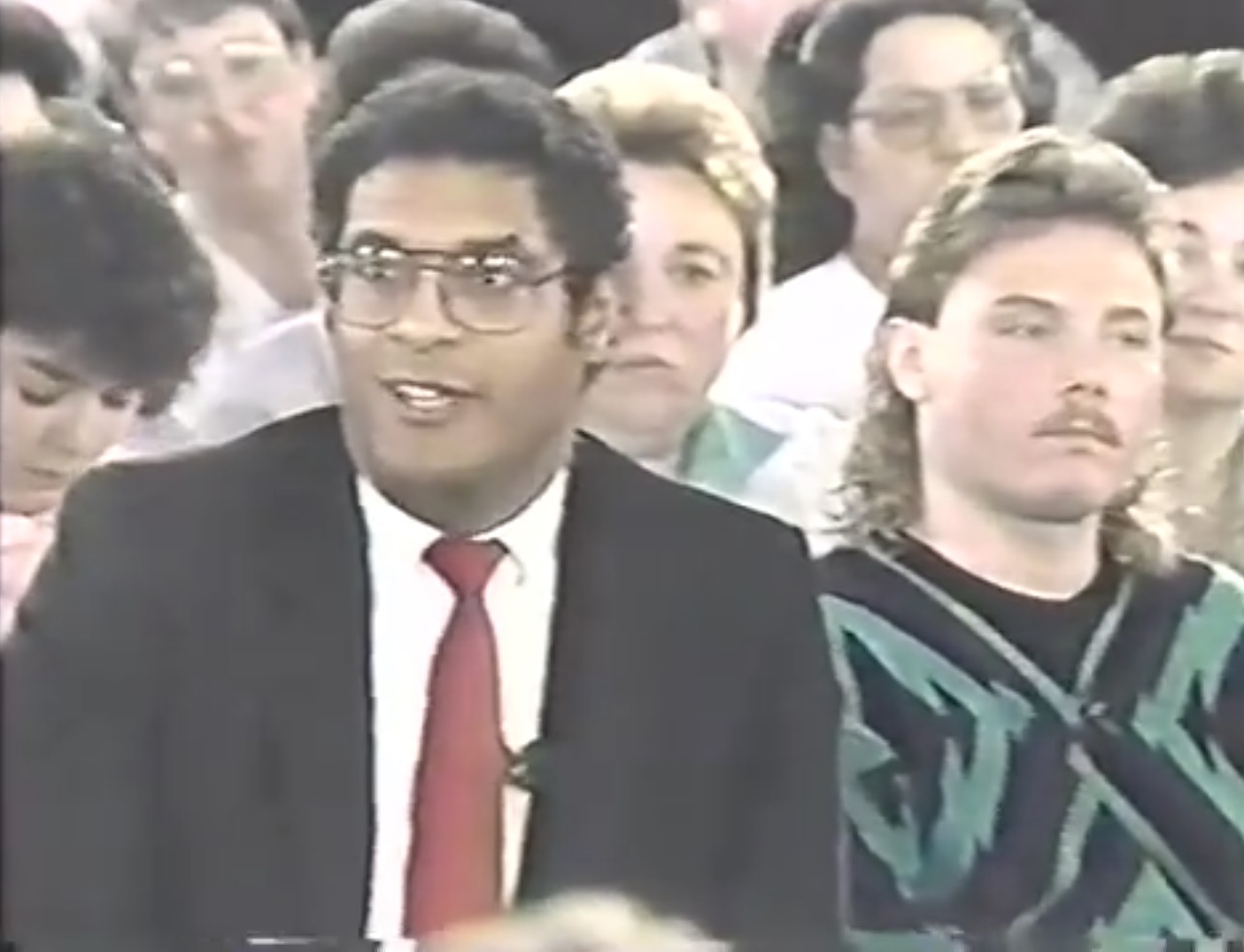 Plus tard dans l’émission, la parole se fait accusatrice envers la parole scientifique : « Nous ne sommes pas sûrs de ce qu’il se passe. Le consensus c’est qu’on ne croit pas la science en général. Parce que les scientifiques disent que tu peux l’attraper comme ça, maintenant ils disent que c’est plutôt comme ça. On ne sait pas où tracer la ligne (je souligne) pour être protégés de cette maladie ». Le docteur Woody Myers [5], commissaire à la santé de l’État de l’Indiana rejoint le débat qui va se recentrer sur le rôle de l’institution médicale dans la vie d’une petite ville états-unienne. Il se distingue du public par sa tenue vestimentaire, portant costard et cravate, là où tous les autres s’habillent avec des vêtements très représentatifs des années 1980 (épaulettes, couleurs flashy, coiffures volumineuses). Sa fonction d’expert est interpellée par Oprah pour expliquer clairement les modalités de transmission du VIH et tenter d’offrir une approche rationnelle de la maladie dans un but pédagogique. Il dit : « Je comprends cette crainte, et c’est une crainte qu’ont de nombreuses communautés à travers les États-Unis, dit-il. Il est très important que les gens connaissent les faits, et les faits sont que cette maladie s’attrape par contact de sang à sang, par contact sexuel, et qu’une mère peut transmettre cette maladie à son enfant. » Or la méfiance de ces habitants envers le discours scientifique ne leur permet pas de voir distinctement cette ligne qui leur permettrait de protéger leur communauté. La panique naît de cette incapacité à « croire » la science, puisque c’est ce qu’on leur demande.