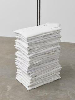 Il ne s’agit pas de représenter l’histoire, mais de donner à sentir ce qui échappe à sa synchronisation unifiée. Dans ses œuvres, la prudence remplace l’exposition. Pas de représentation directe des victimes ni des armes, mais des objets intimes – chemises, chaises, lits – qui portent la mémoire silencieuse de la violence. Ses sculptures, comme Tabula Rasa – table réduite à l’état d’amas d’éclats qui sont recomposés un par un – prennent acte de l’impossibilité d’une table rase, et tiennent la tension entre destruction et reconstruction fragmentaire, lente, vulnérable. Les chemises empalées (Untitled, 1989-1990) témoignent d’une violence de masse.